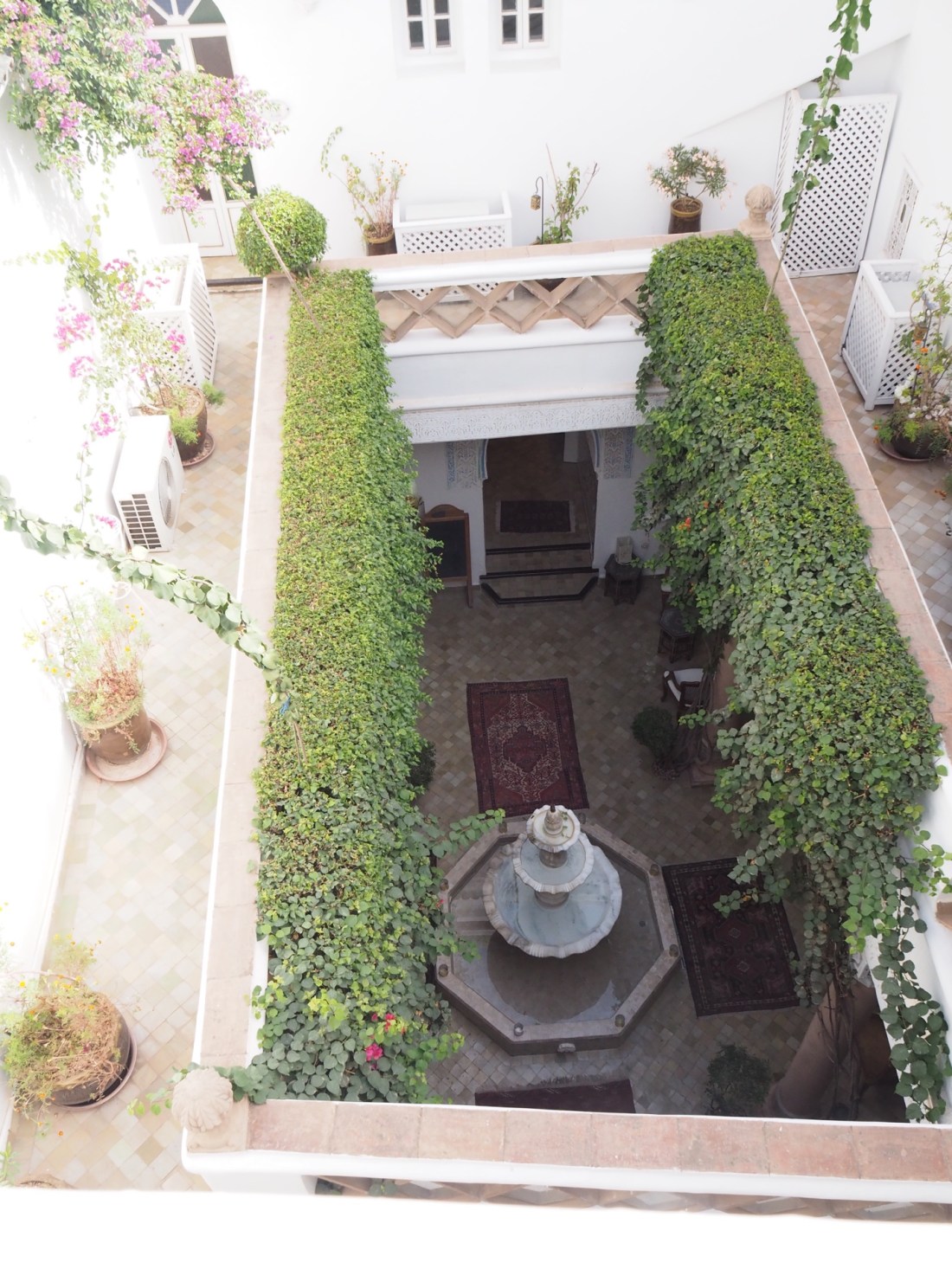 Then you enter the main open air courtyard, and are immediately charmed by the marble fountain tinkling in the center, filled with rose petals, and the birds singing and flying in and out. Here is a picture of that courtyard from above.