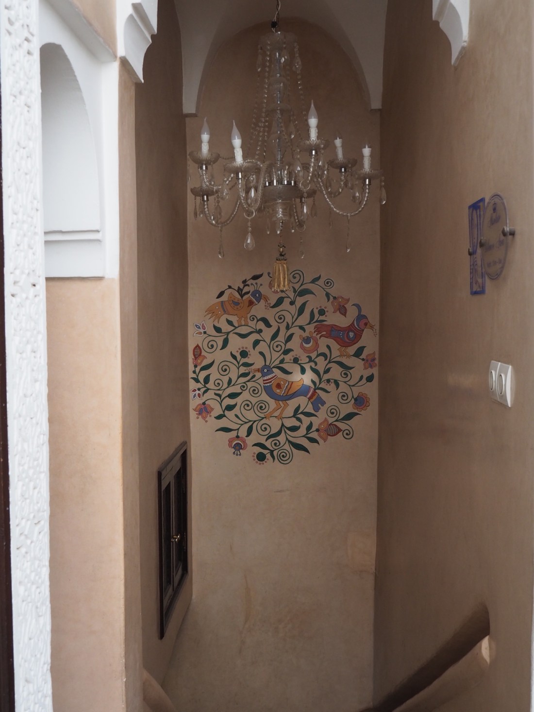 My room was on the top floor, reached by a narrow and winding stair, with a chandelier overhead and hand painted mural on the wall.