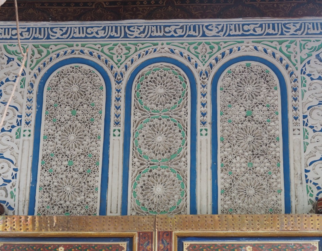 And the beautifully carved plaster immediately above, which, unlike most of the carved plaster we have seen in Morocco, is painted as well