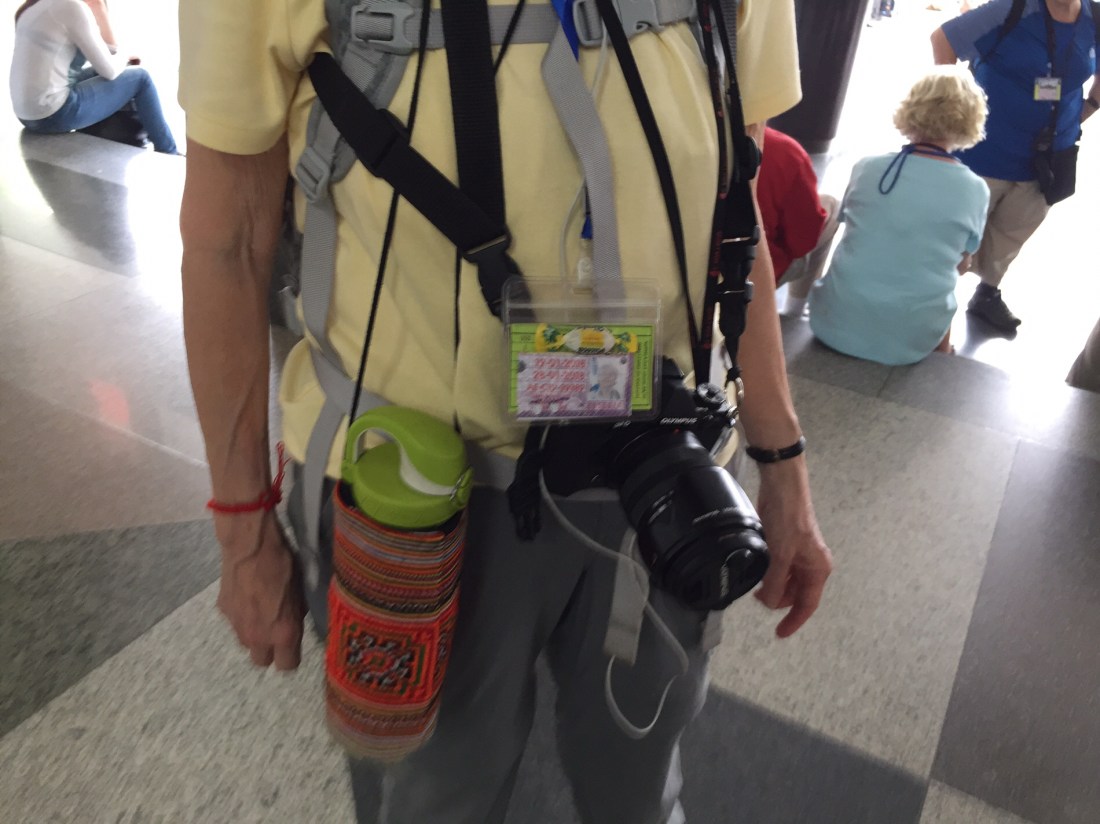 This is a midriff shot that shows everything I have been carrying around my neck: Backpack, water bottle, name tag/temple entrance ticket, camera. And not visible the “whisper” device that connected to my headphones so I could hear the information provided by our tour leader about what we were seeing.
