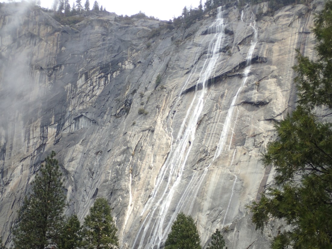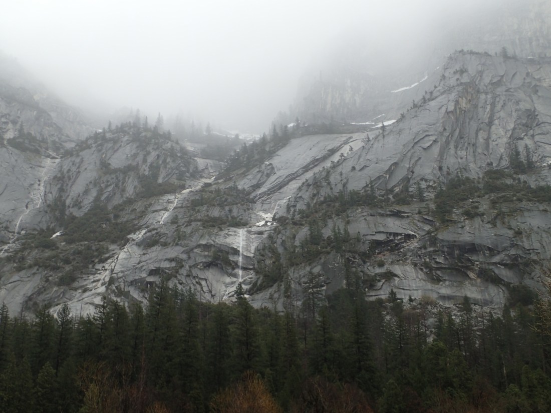 Soon, we broke out of the trees and boulders to stand on the side of Mirror Lake and look across it to the south walls of the valley. Unfortunately, half dome was wreathed in fog, but again there are little waterfalls everywhere, cascading off the granite