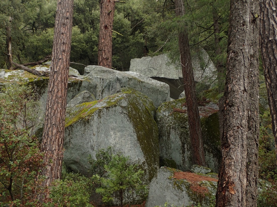 This jumble of rocks appeared around a corner in a stand of Ponderosa pines and Douglas firs, which obviously have grown up after the rocks fell.