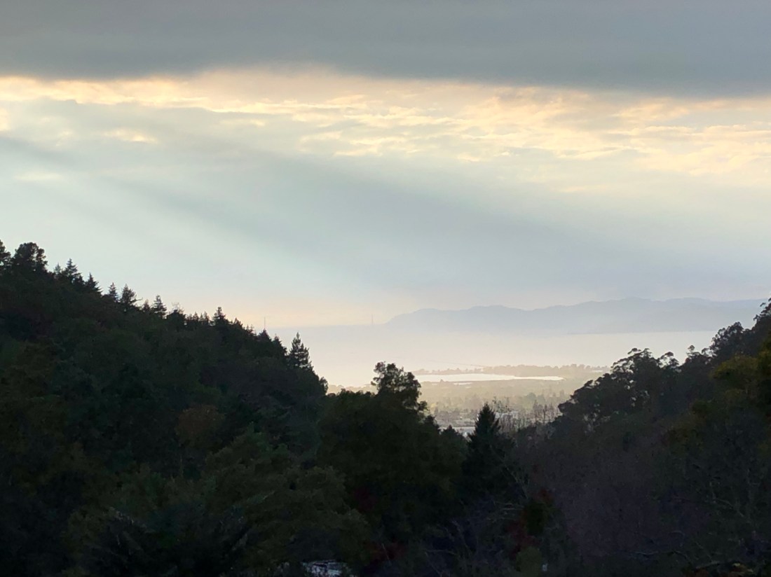 I was in the garden at the end of the day, and was rewarded with an approaching sunset from the garden of old roses near the top of the garden, looking out towards the Golden Gate Bridge.